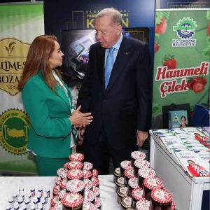 Başkan Topak, Cumhurbaşkanı Erdoğan’a Ergene’nin kadın emeğiyle üretilen yerel ürünleri, yürütülen sosyal projeleri ve belediyenin üretim odaklı yaklaşımı hakkında bilgi verdi.
